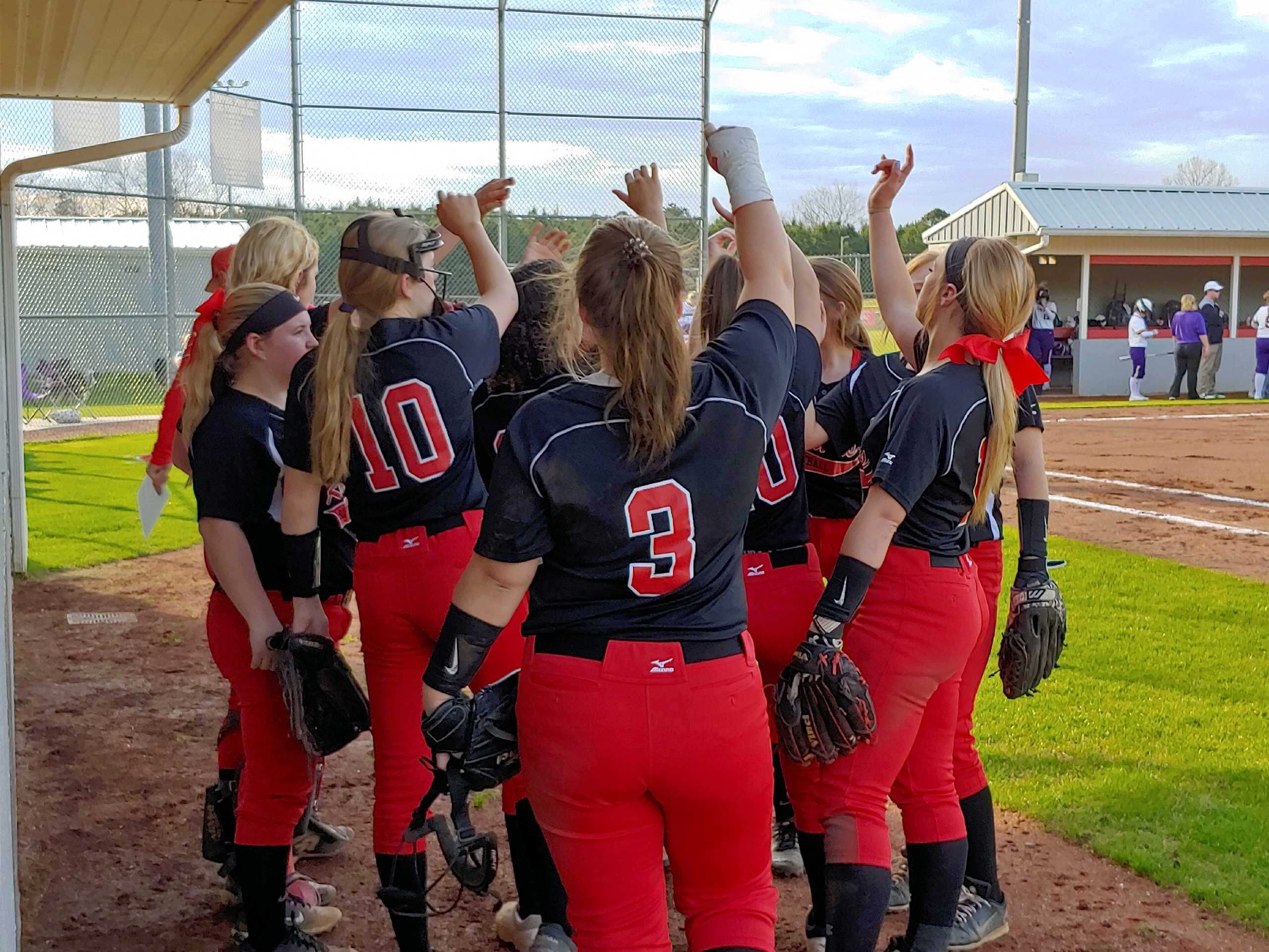 The Lady Raiders huddle up before taking the field during their 11-0 win over Fairview on Tuesday. (Sammy Confer for The Cullman Tribune)
