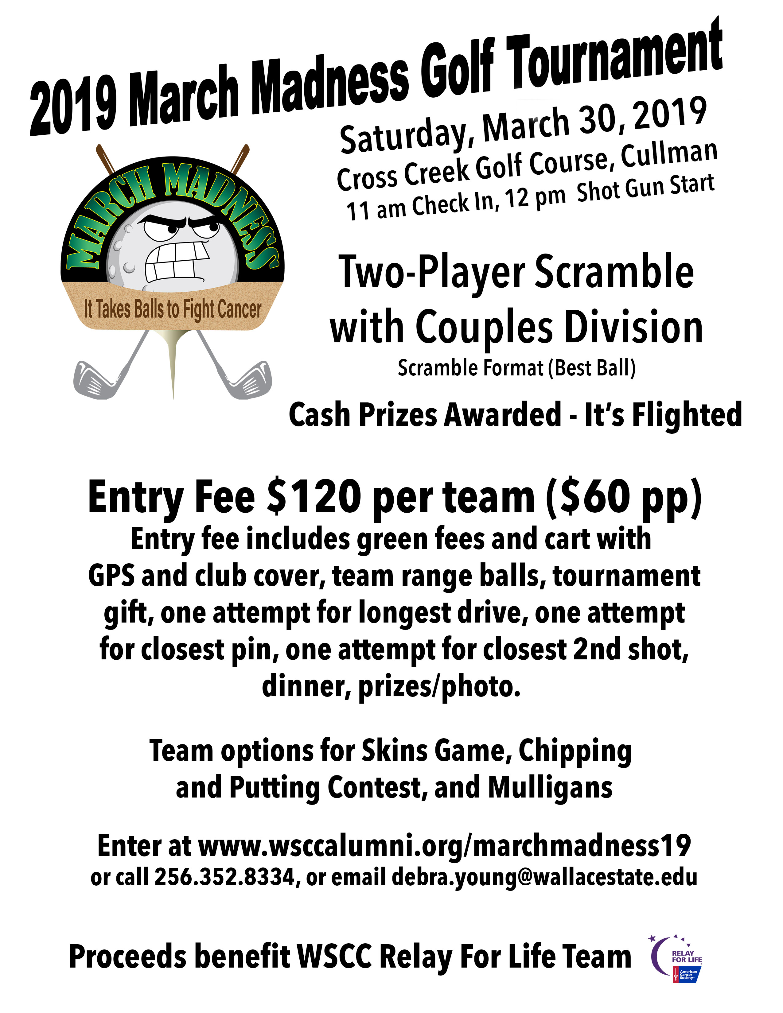 Wallace State’s Relay For Life Team is gearing up for its March 30 March Madness Golf Tournament at Cullman’s Cross Creek Golf Course. The event is a flighted two-person scramble with a couple’s division offering cash prizes. Registration will begin at 11 a.m. with a shotgun start at noon. Prizes will be awarded at 5 p.m.