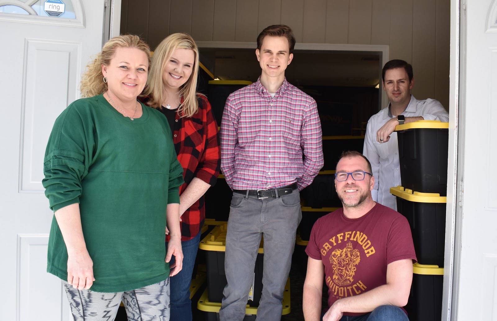 Ashley Wilson (left) with volunteers Crystal Stone, Ethan Ponder, Jeremy Holley and Brandon Snider spent Thursday unloading stacks of storage totes to get Curt’s Closet ready for summer.