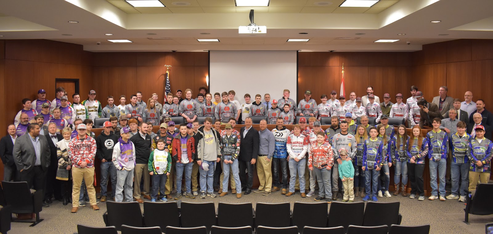 Members of area school fishing teams pose for pictures with pro fishermen and representatives of Major League Fishing, along with local officials, after the announcement on Wednesday, Feb. 20, 2019 that Cullman and Smith Lake will host Stage Five of the 2019 Major League Fishing Bass Tour from April 30 through May 5. The event will coincide with a “festival-style fan experience” in downtown Cullman’s Depot Park and Festhalle. (W.C. Mann for The Tribune)