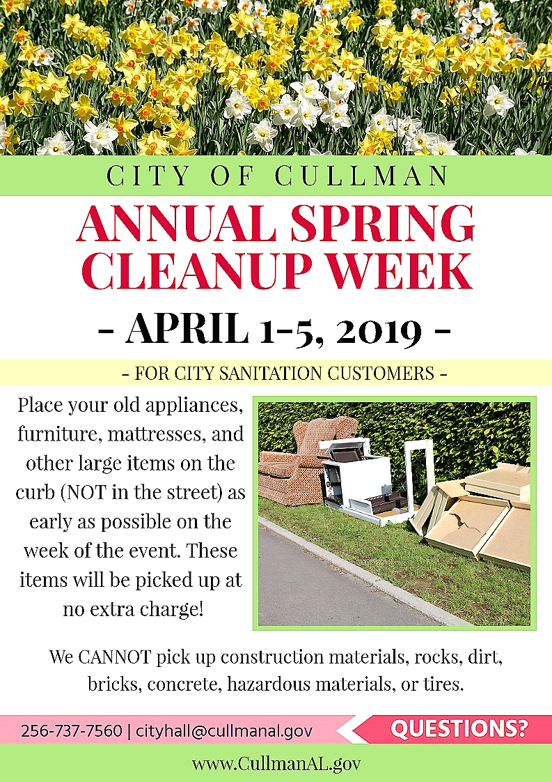 CULLMAN, Ala. – Next week is the City of Cullman’s annual Spring Cleanup. From April 1-5, Cullman City Sanitation will pick up furniture, mattresses, appliances and other large items at no extra charge. City Sanitation customers who wish to participate are asked to place items curbside as early as possible. Customers are asked to NOT place items in the road.