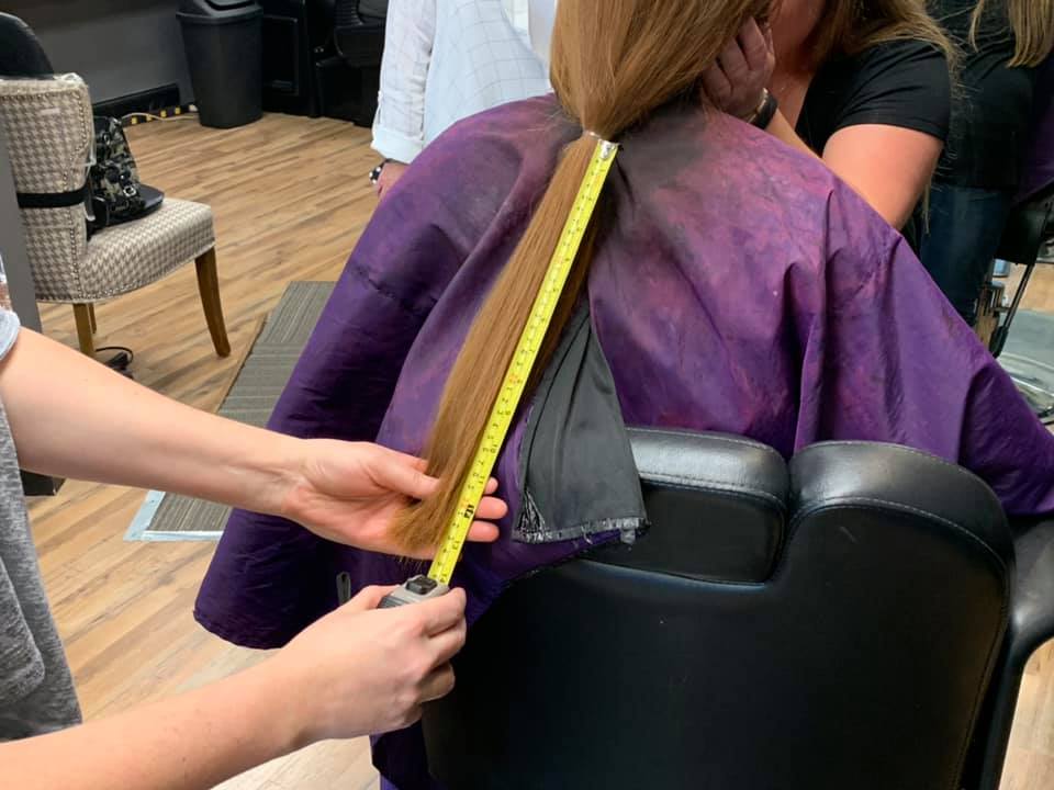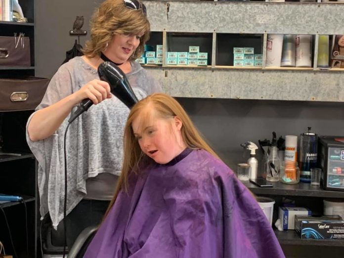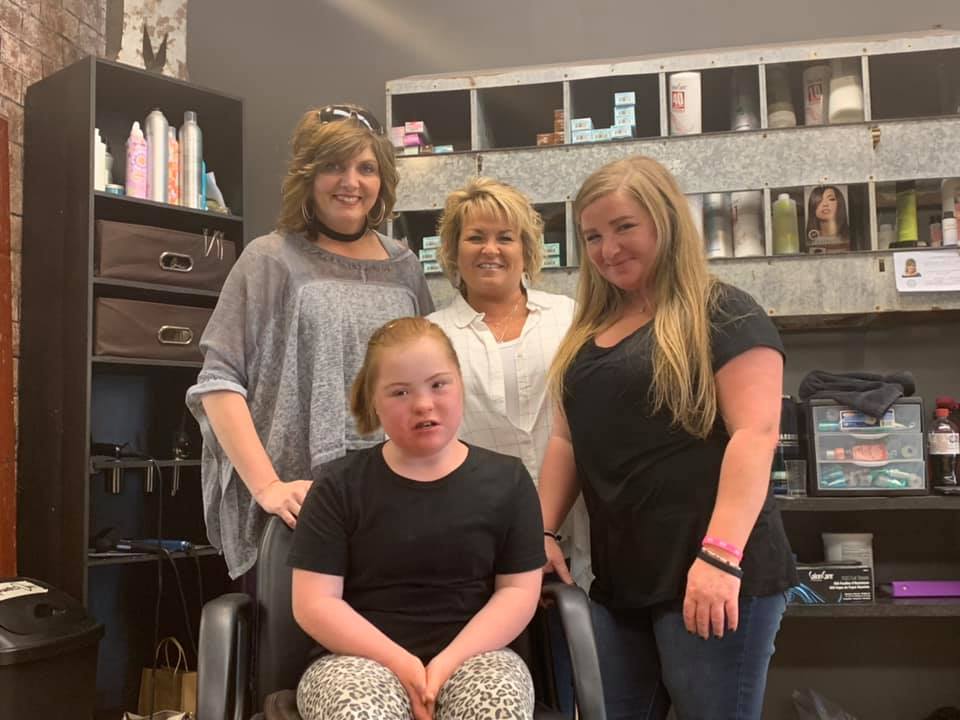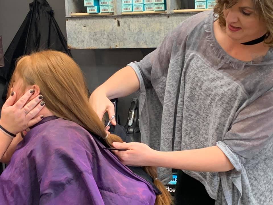 Blakeley’s mother Laina Fine and grandmother Lisa Nelson brought her to the salon where Misty Fletcher washed and cut her hair. All the family members have been customers of Misty’s for years, and about a year ago, they began researching places to donate hair that didn’t charge patients for wigs, leading them to the Hugs-U-Wear program.