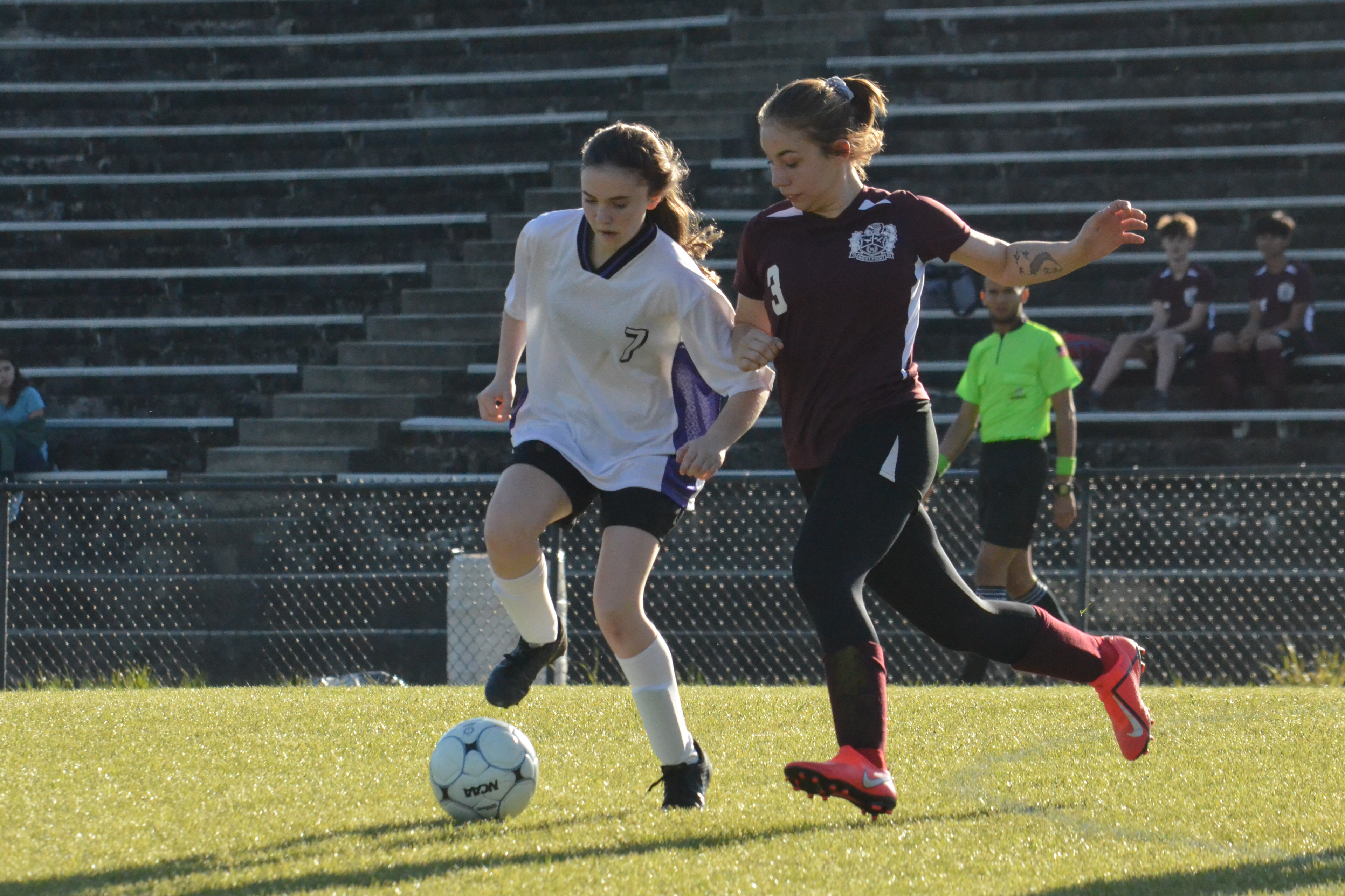 West Point's Faith Lee (3) fights a Danville defender for the ball during the Lady Warriors' 5-1 win on Tuesday. (Nick Griffin for The Cullman Tribune)