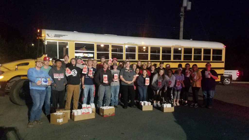 Teresa Fincher, a Cullman County Board of Education employee, was contacted. Fincher’s servant’s heart and contacts with members of the community jumpstarted the fundraising efforts. Tracy Smith and Adriann Basch, who head the Health Science department of CATA, started a Facebook campaign to raise monies, supplies and gift cards for the project. Local Cullman businesses, civic clubs, churches, several area schools and community members all participated in the efforts to help. A Coin Drive was organized campus-wide at CATA with a total of $500 being raised. On the day the students and several members of the CATA faculty rolled into Lee County, they had in hand, $7,000 in gift card donations. Additionally, with the help of these entities, they were able to give a book bag to EVERY student (approximately 450),still dealing with the tragedy and the loss of several classmates.