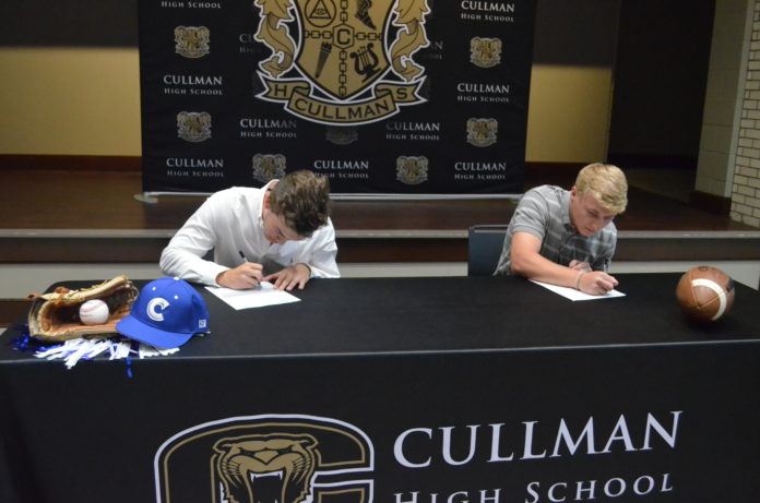 CULLMAN, Ala. – Family, friends, teammates and coaches packed Cullman High School’s Tillman Hall Wednesday afternoon to celebrate a pair of Bearcats taking their athletic careers to the next level. Seniors Peyton Colvard and Seth Gable signed letters of intent to Calhoun Community College and Birmingham-Southern College where they will continue their baseball and football careers, respectively.