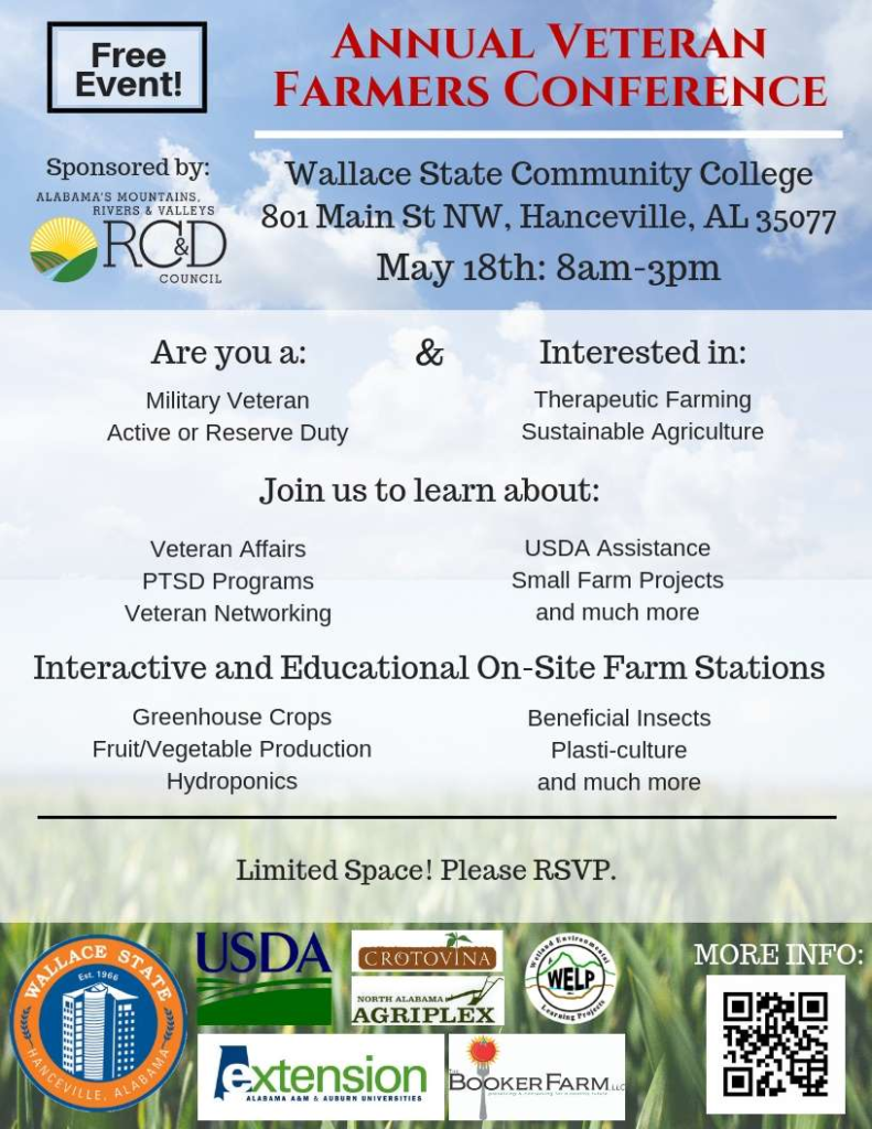 HANCEVILLE, Ala. – This Saturday, May 18, the Veteran Farmers Conference will take place at Wallace State Community College. Sponsored by The Alabama Mountains, Rivers & Valleys Resource Conservation & Development Council, the conference will offer military veterans, active duty and reserve personnel an opportunity to learn more about therapeutic farming and sustainable agriculture.