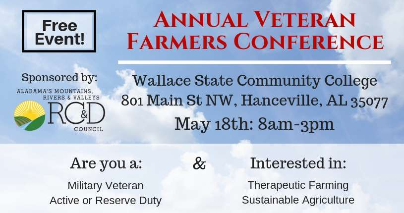 HANCEVILLE, Ala. – This Saturday, May 18, the Veteran Farmers Conference will take place at Wallace State Community College. Sponsored by The Alabama Mountains, Rivers & Valleys Resource Conservation & Development Council, the conference will offer military veterans, active duty and reserve personnel an opportunity to learn more about therapeutic farming and sustainable agriculture.
