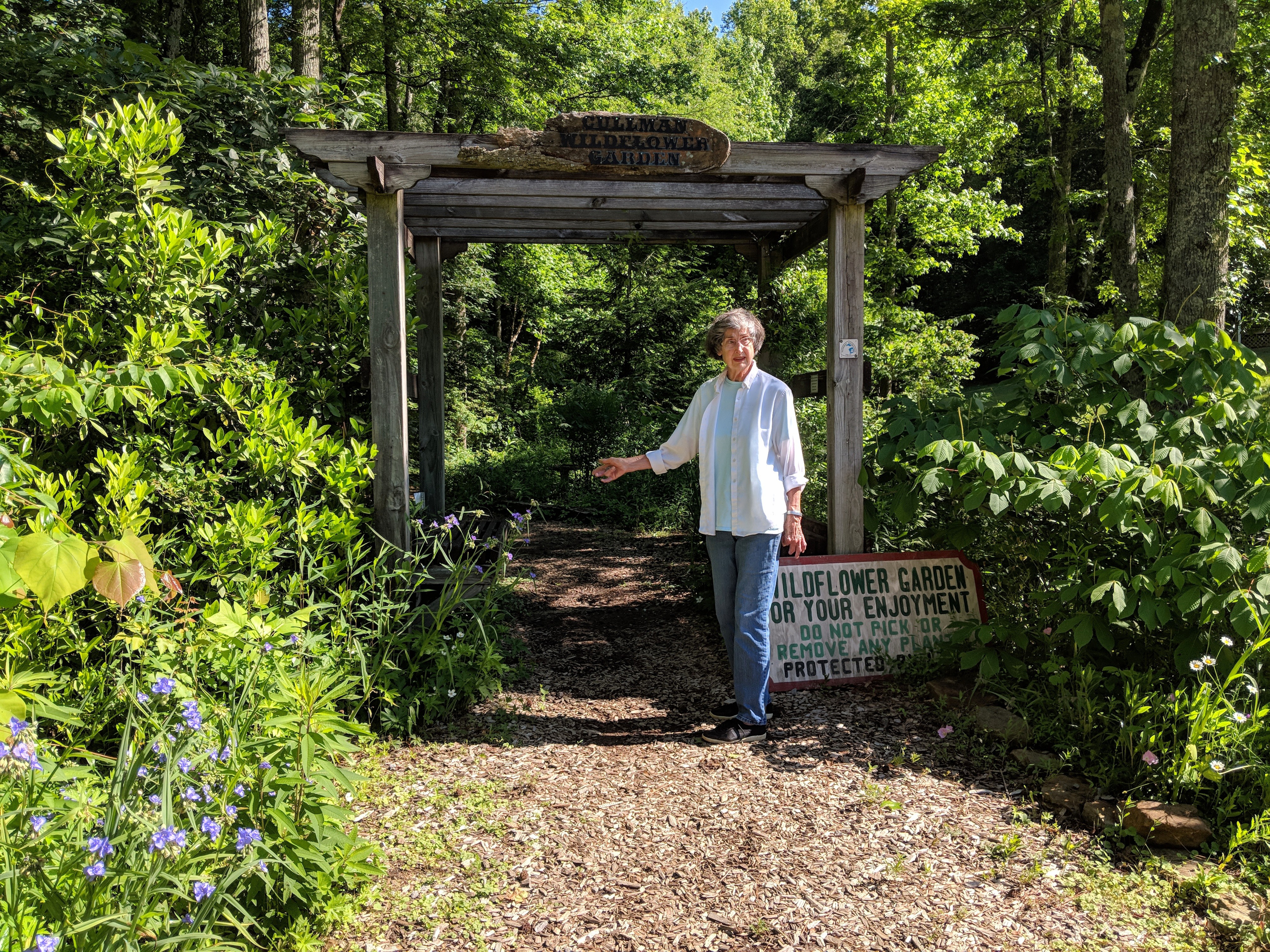 Cullman Native Plant Society garden volunteer Nona Moon at the entrance to The Native Plant Garden and Trail at Sportsman Lake Park (Heather Mann for The Cullman Tribune)