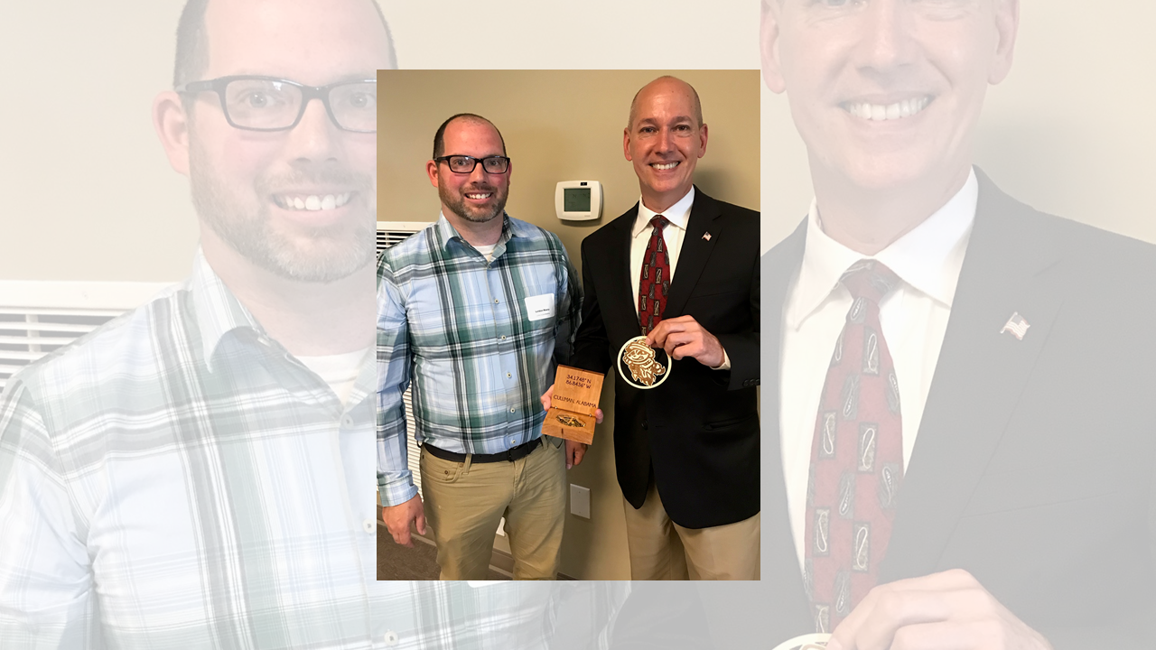 Cullman’s Leldon Maxcy, left, and Emo Furfori, director of communication relations and corporate sponsorships for Ballcorps, LLC, right, pose for a photo at Friday’s Cullman Area Chamber of Commerce May Community Luncheon. Maxcy, owner of Leldon’s Scrollsawing/ Leldon’s Wooden Art, created the compass and Trash Panda logo held by Furfori. (Christy Perry for The Cullman Tribune)