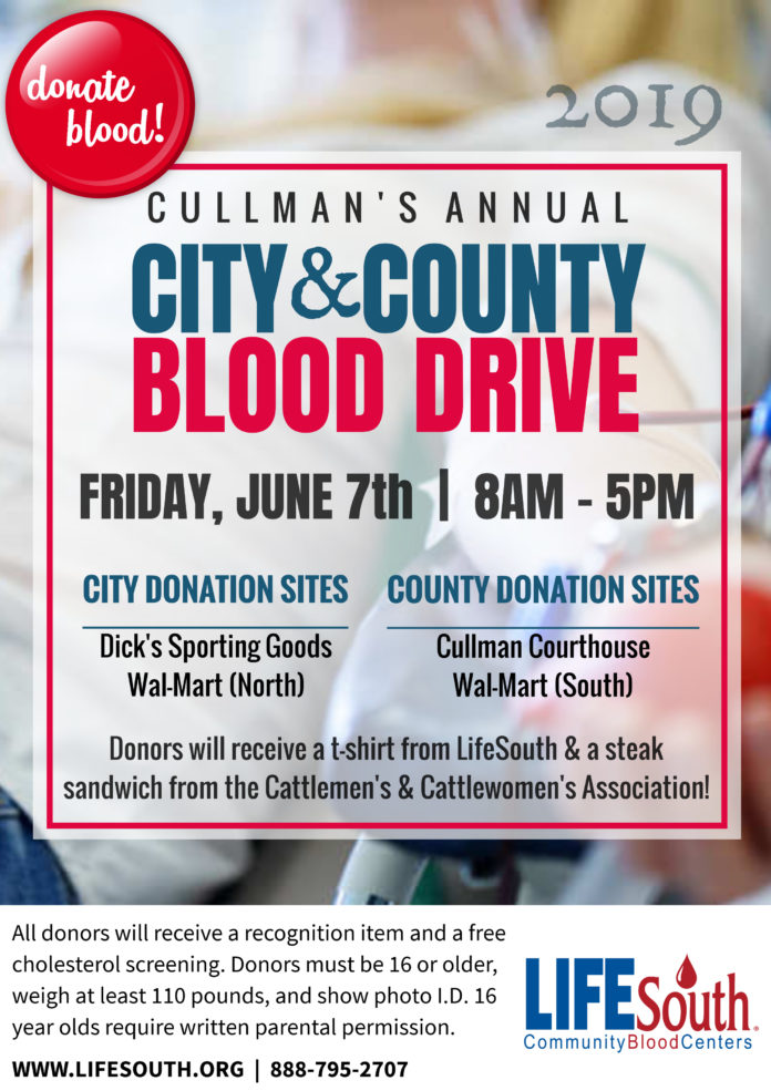 CULLMAN, Ala. – Join us for our annual Cullman City & County Blood Drive on Friday, June 7, 2019, from 8 a.m. until 5 p.m.