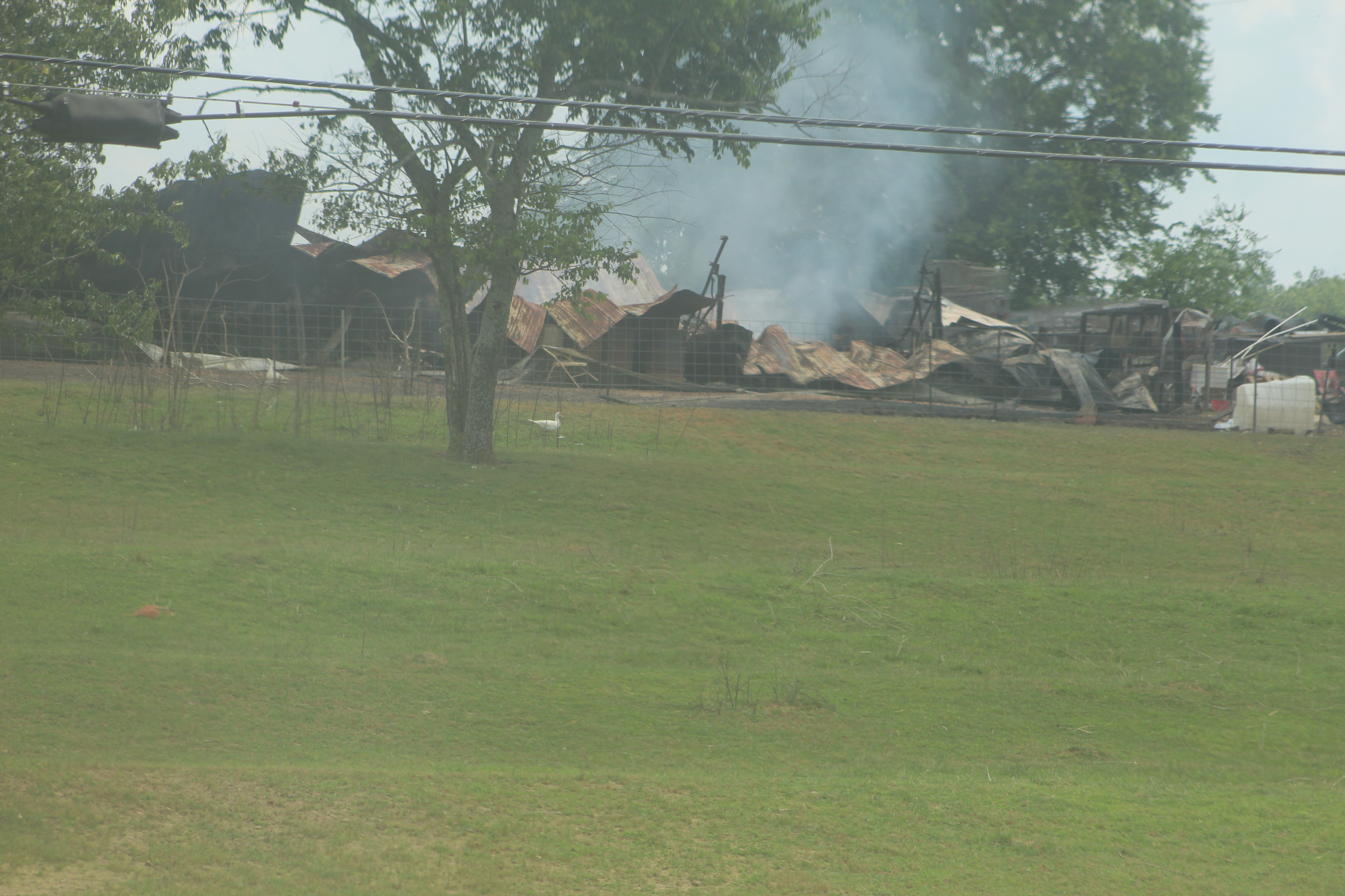 The remains of a chicken house that was filled with hundreds of animals smolder along Country Road 1223 Tuesday morning. (Christy Perry for The Cullman Tribune)