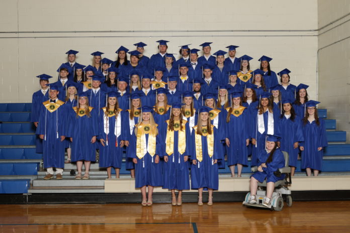 (Left to right) Front row: Valedictorian Emily Seymore, Class President Mattie Womack, Salutatorian Destiny Walker and (seated-Taylor Aldridge); second row: Jaden Blackwood, Samantha Brannon, Tess Alvis, Brieanna Ory, Lauren White, Natalie Jefferson, Sarah Parris, Kailee Hill, Julianna Plaza, Maria Morales and Alexis Engle; third row: Isaac Lancaster, Lydia Lynn, Gage Gilliland, Connor Herald, Hayden Ray, Corey Robins, Garrett Wood, Haleigh Holland, Katelyne Walker, Kaylee Bartlett, ShiRee Lapeyrouse; fourth row: Kade Thompkins, Alayna Darty, Kellie Miller, Hayley Clinton, John Naylor, Trace Thompson, Chris Thies, Jada Moore, Amber Foster and Morgan Boyd; fifth row: Chandi Netherton, Colby York, Chase Gilliland, Noah Townsend, Zayne Guthrie, Howie Watson, Katie Pigg and Asia Millwood; sixth row: Jacob Hann, Taylor Porter, Olivia Byrams, Hunter Warren, Hayden Lee, Mark Harrington, Ethan Smith and Zeb Cutcher