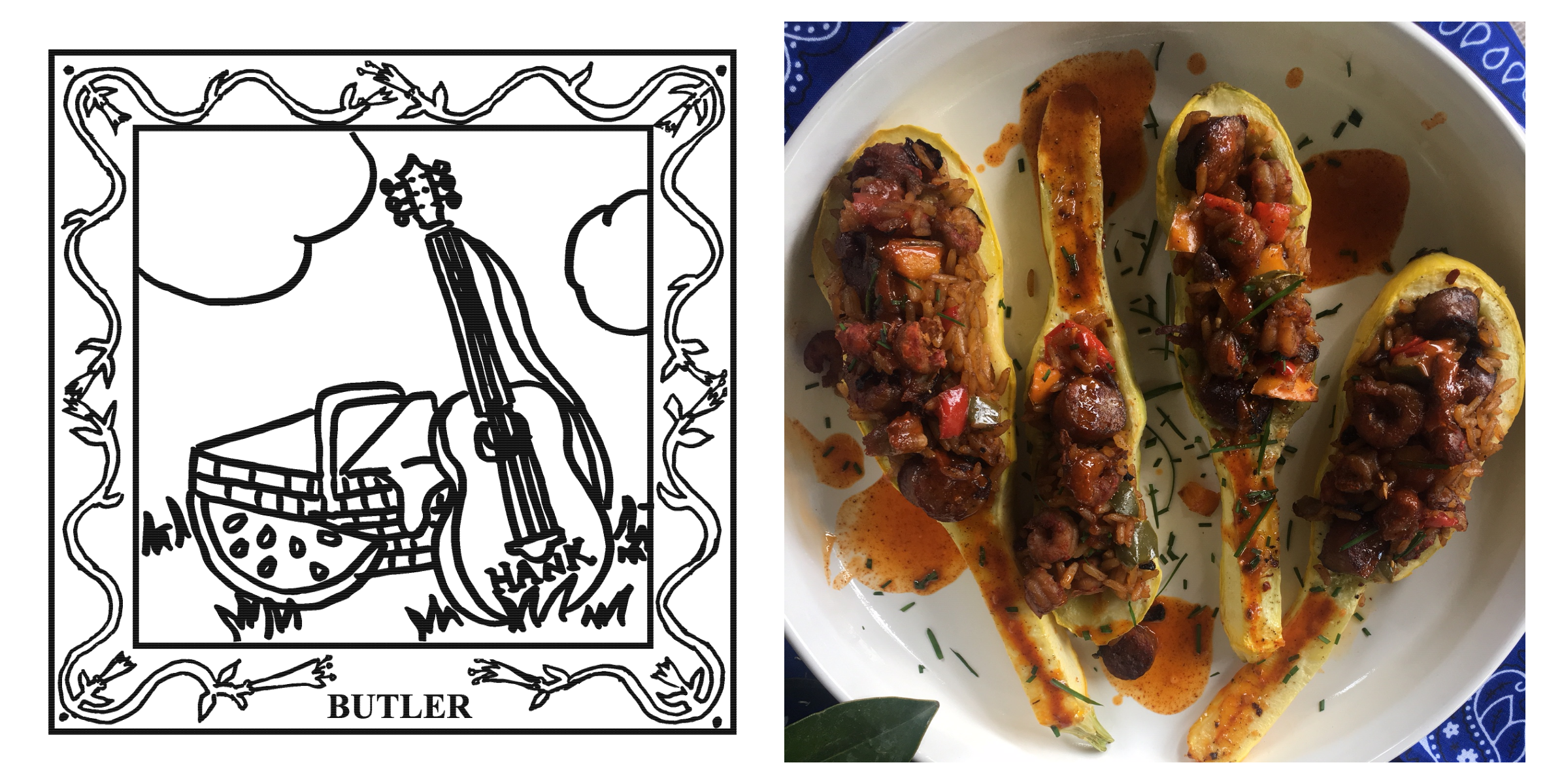 Butler County – “Strumbalaya” – Jambalaya and Crawfish Stuffed Squash Guitars (4 servings)