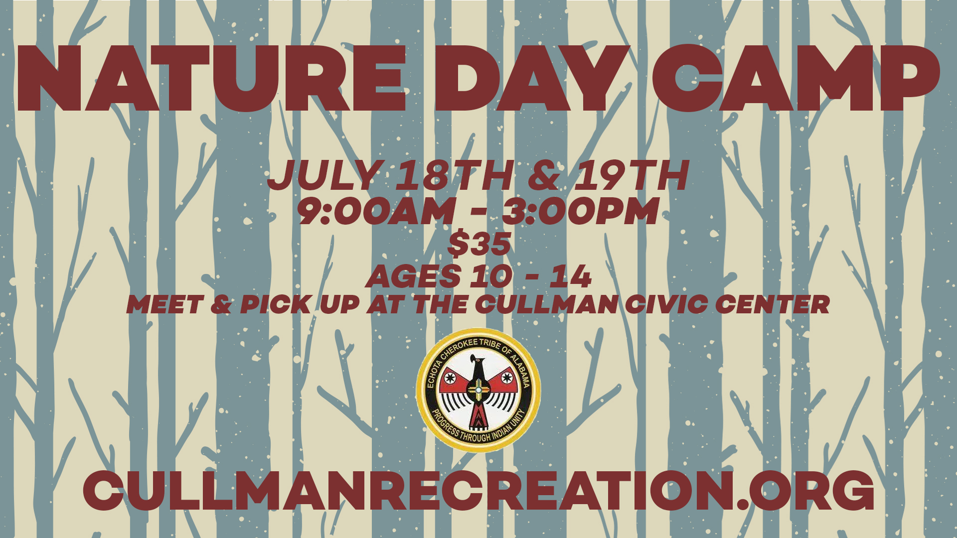 Targeting ages 10-14, the camp will drop off and pick up at the Cullman Civic Center.  The campers will travel to the WaterWorks Center for Environmental Education in Hartselle, Hurricane Creek Park and the Echota Cherokee Lands.