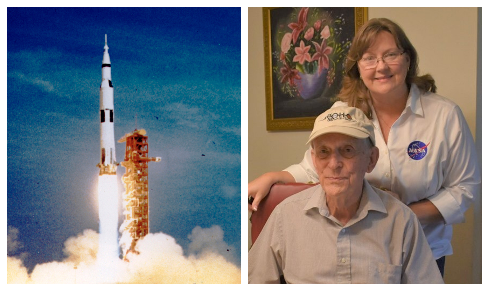 (left) The Apollo 11 mission, the first manned lunar mission, launched from the Kennedy Space Center, Florida via the Marshall Space Flight Center (MSFC) developed Saturn V launch vehicle on July 16, 1969 and safely returned to Earth on July 24, 1969. The Saturn V vehicle produced a holocaust of flames as it rose from its pad at Launch complex 39. The 363-foot-tall, 6,400,000-pound rocket hurled the spacecraft into Earth parking orbit and then placed it on the trajectory to the moon for man’s first lunar landing. Aboard the space craft were astronauts Neil A. Armstrong, commander; Michael Collins, Command Module pilot; and Edwin E. Aldrin Jr., Lunar Module pilot. With the success of Apollo 11, the national objective to land men on the Moon and return them safely to Earth had been accomplished. (NASA); (right) Pushing the limits of space exploration for two generations: former NASA contractor Joe Hayden with daughter and current NASA engineer Mary Hayden Hovater (W.C. Mann for The Cullman Tribune)