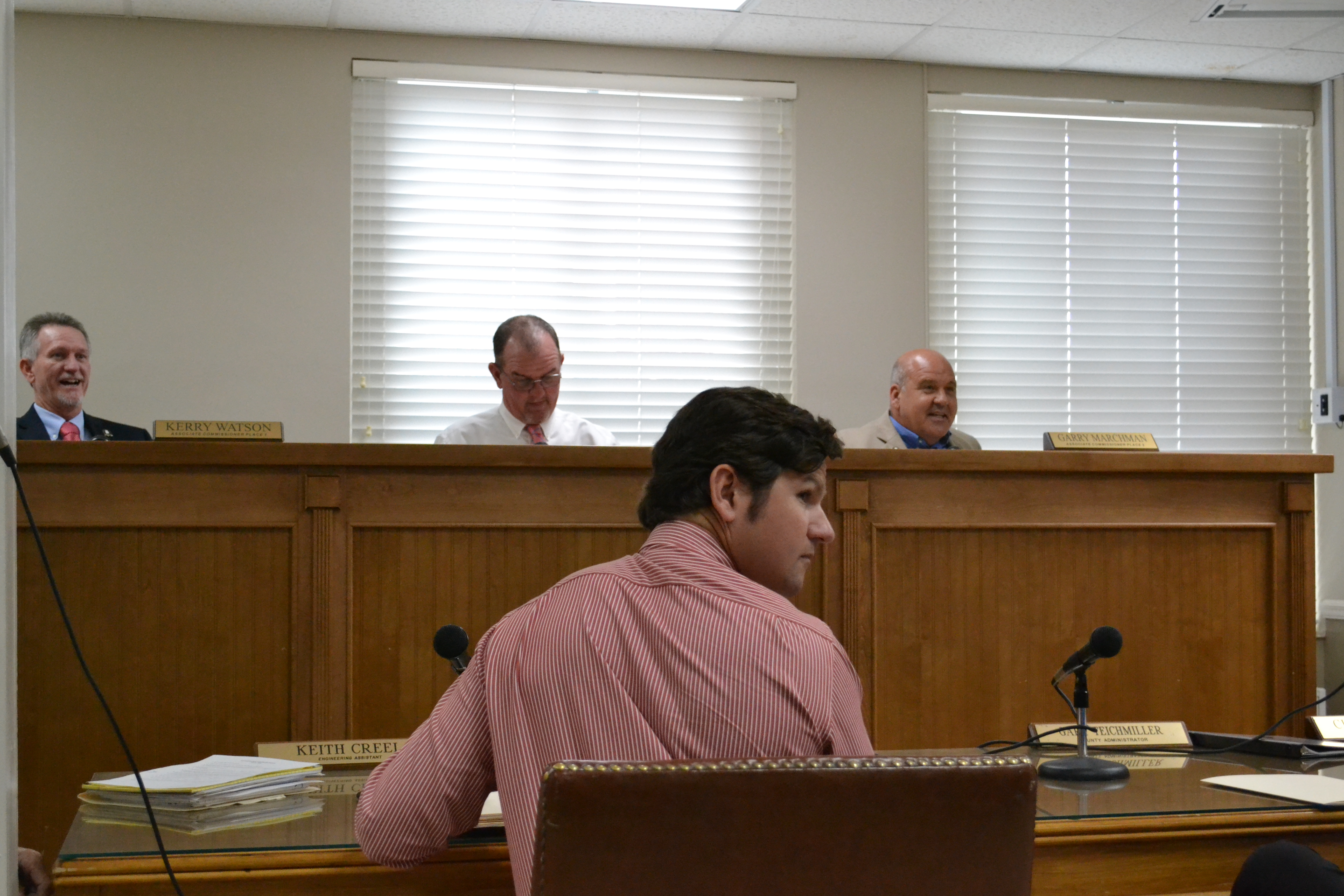 Cullman County Engineer John Lang (foreground), with Commissioner Kerry Watson, left, Chairman Kenneth Walker, center and Commissioner Garry Marchman, right at Tuesday’s meeting (Maggie Darnell for The Cullman Tribune)