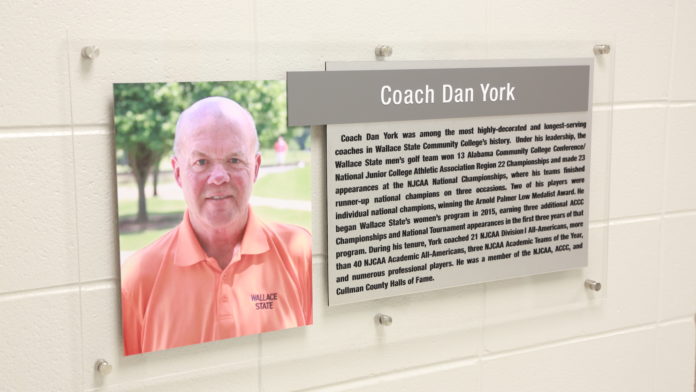 HANCEVILLE, Ala. – A golf practice facility in the Wallace State Wellness Center was officially named in honor of the late Coach Dan York this week with family, friends, employees and current and former players in attendance. That facility includes an indoor driving range and putting green.