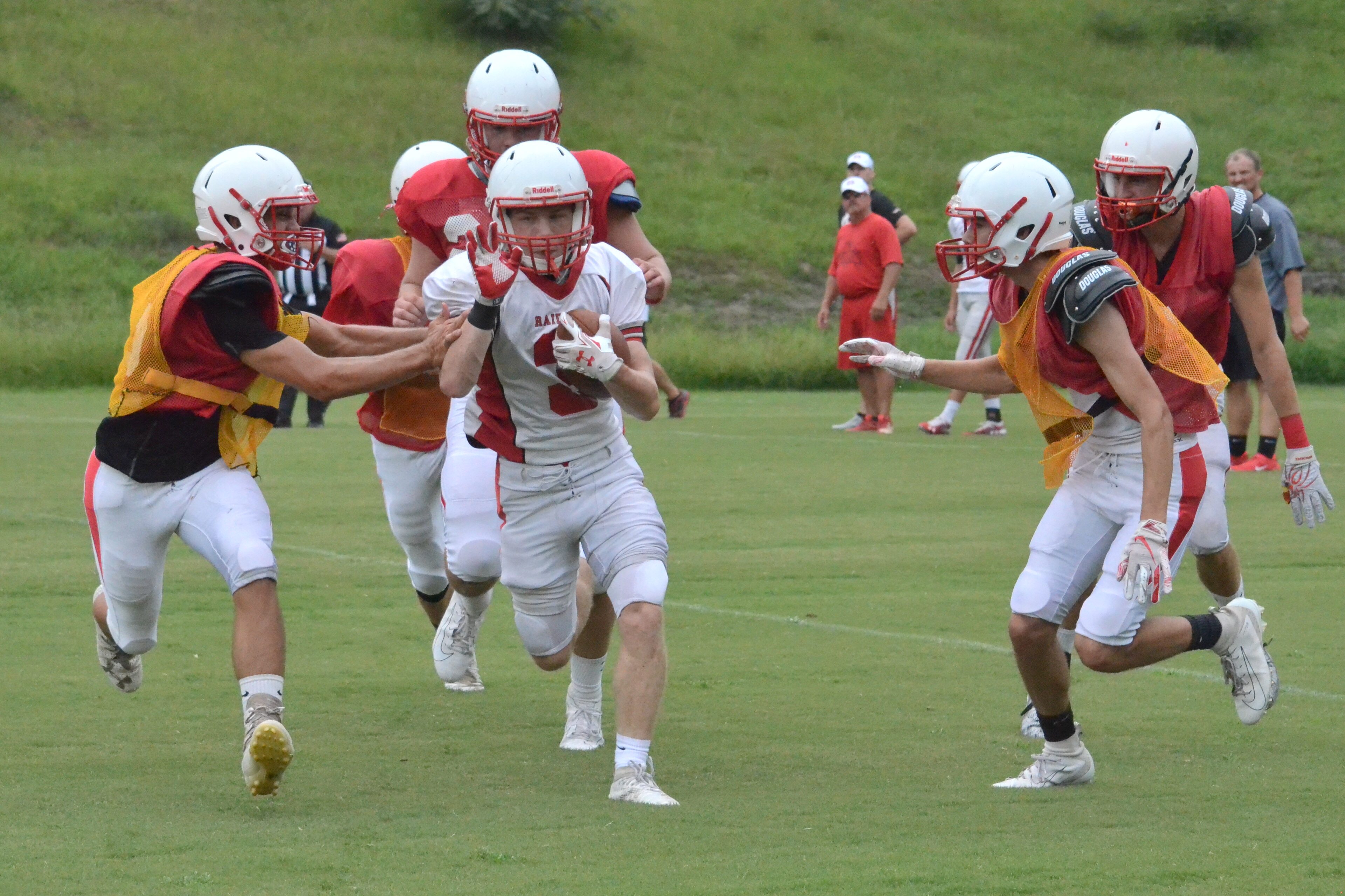 Raiders Head Coach Alan Scott was excited for his kids to get some reps in full pads in a game-like situation after the first week of fall practice. It was a controlled environment for the coaches to work with certain groups in certain situations and they wanted everyone to stay up off the ground, but it was still a good chance for both front lines to be physical at the point of attack.