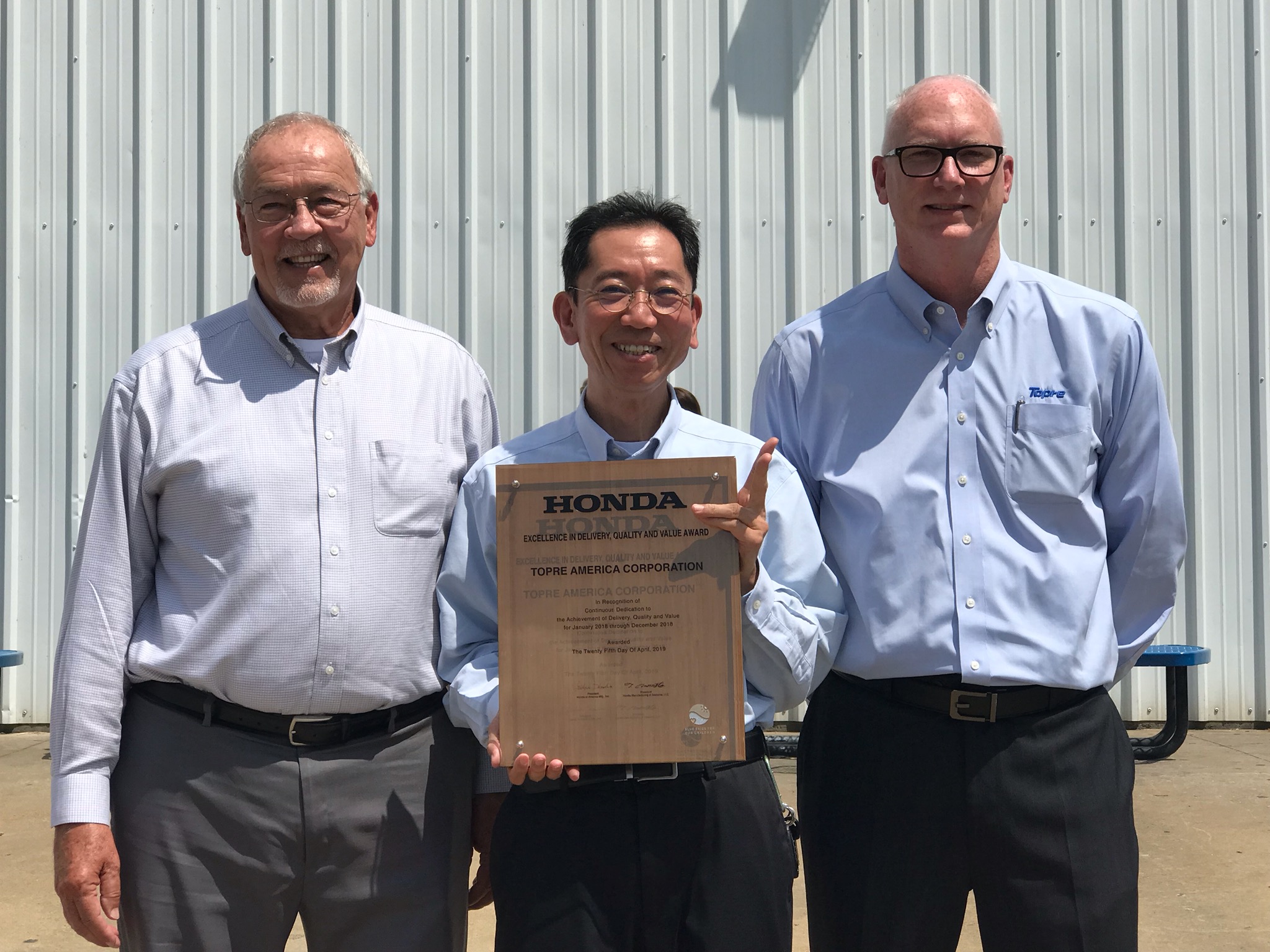 Lapham presented the award to Topre America President Hideo Shimizu and Vice President of Operations Brad Pepper.