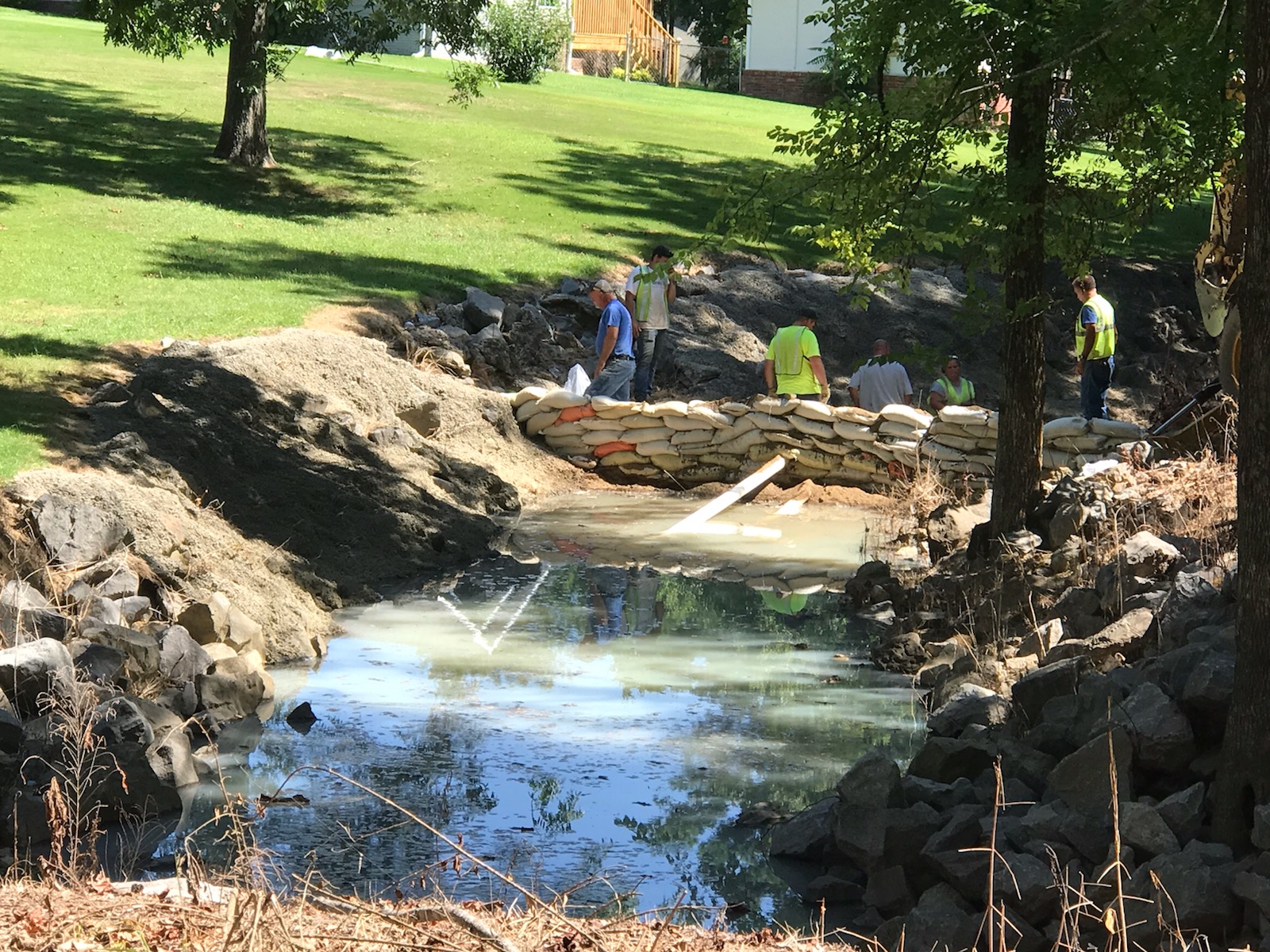 City of Cullman workers constructed a dam in Ryan Creek in the Carroll Acres subdivision on the city’s southeast side after chemicals were spilled into the water following a fire at Professional Coatings. (Christy Perry for The Cullman Tribune)