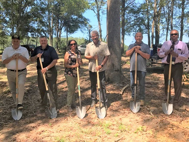From left to right are Ken Brown, Barry Willingham, Connie Jones, Irv Jones, Damon Monk and Willie J. Fields at the groundbreaking for Connie’s Cottages, a low-cost veteran community in Crane Hill. (Christy Perry for The Cullman Tribune)