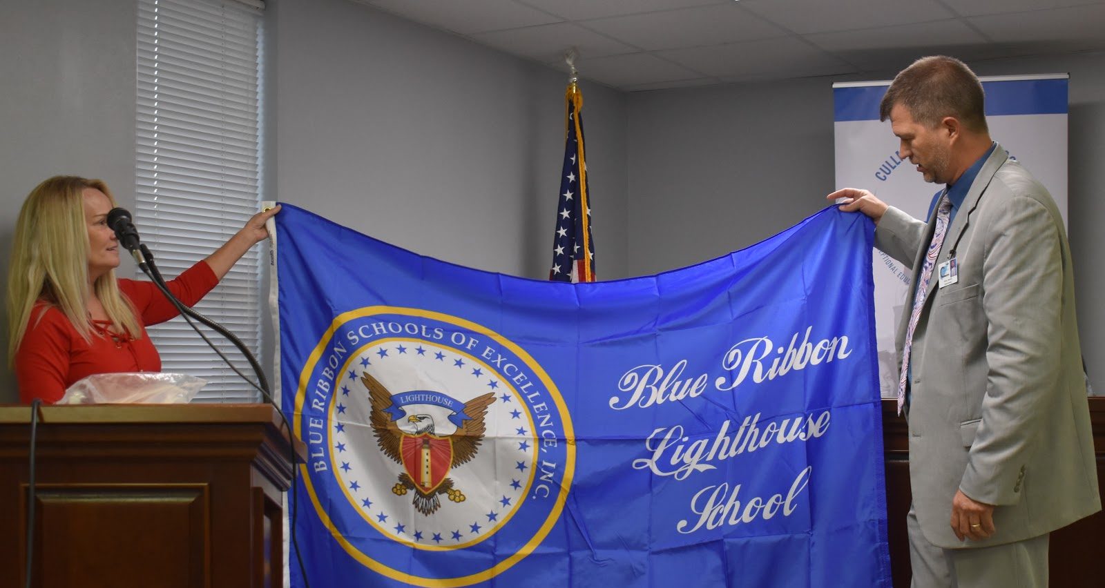 She went on to commend Barnette for “vision,” “leadership” and “listening, caring and communicating,” before announcing his being named as a Blue Ribbon School Superintendent and presenting him the organization’s Lighthouse banner. Barnette is the first superintendent to ever be given the distinction.