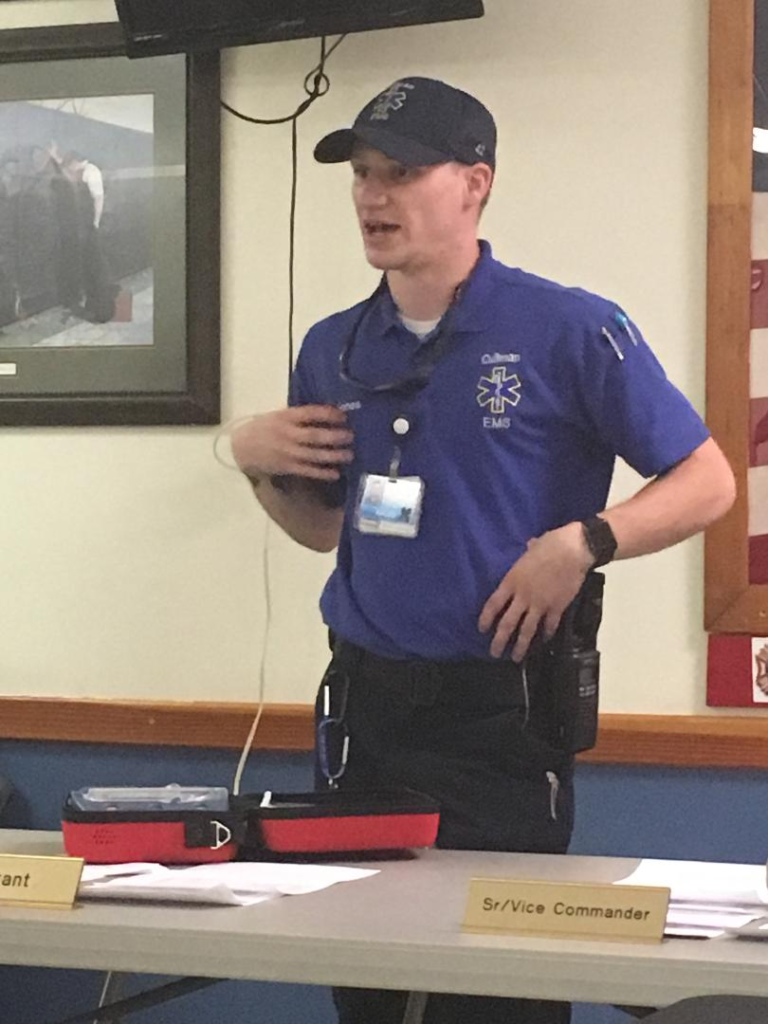 EMTs Kaleb Jones and Kristen Wilks from Cullman EMS came out to walk post members through the procedure for using the device.