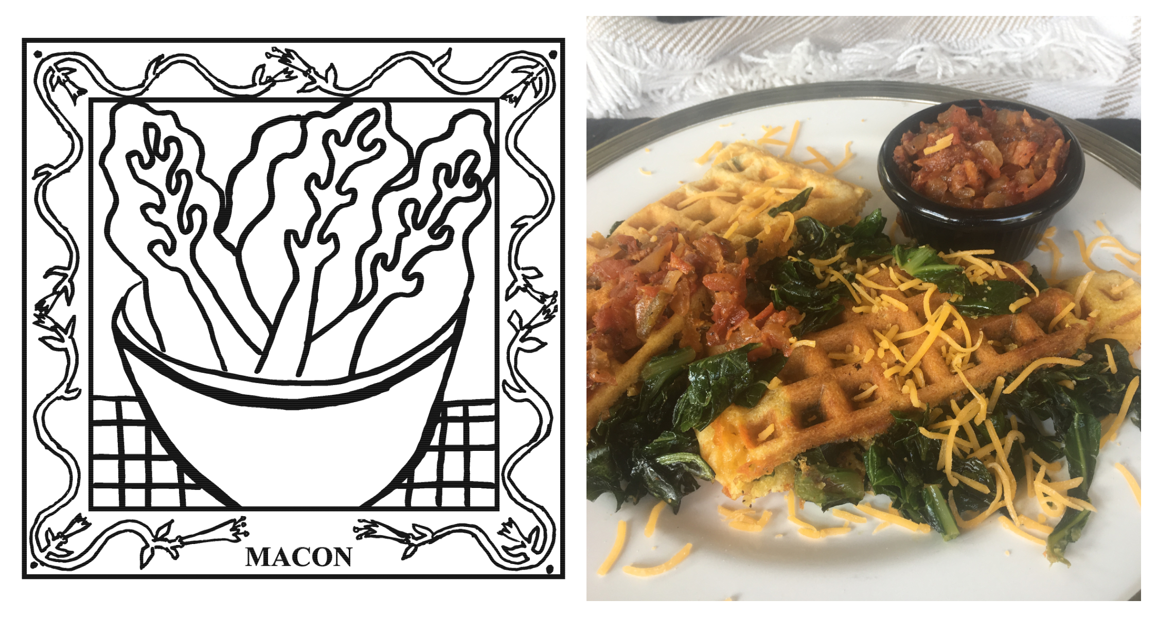 Thank you to Laurie Johnson who created the recipe for Collard Green Stuffed Cornbread Waffles with Bacon and Tomato Jam which adds another creative use of this green-leafed goodness to the Alabama recipe box.