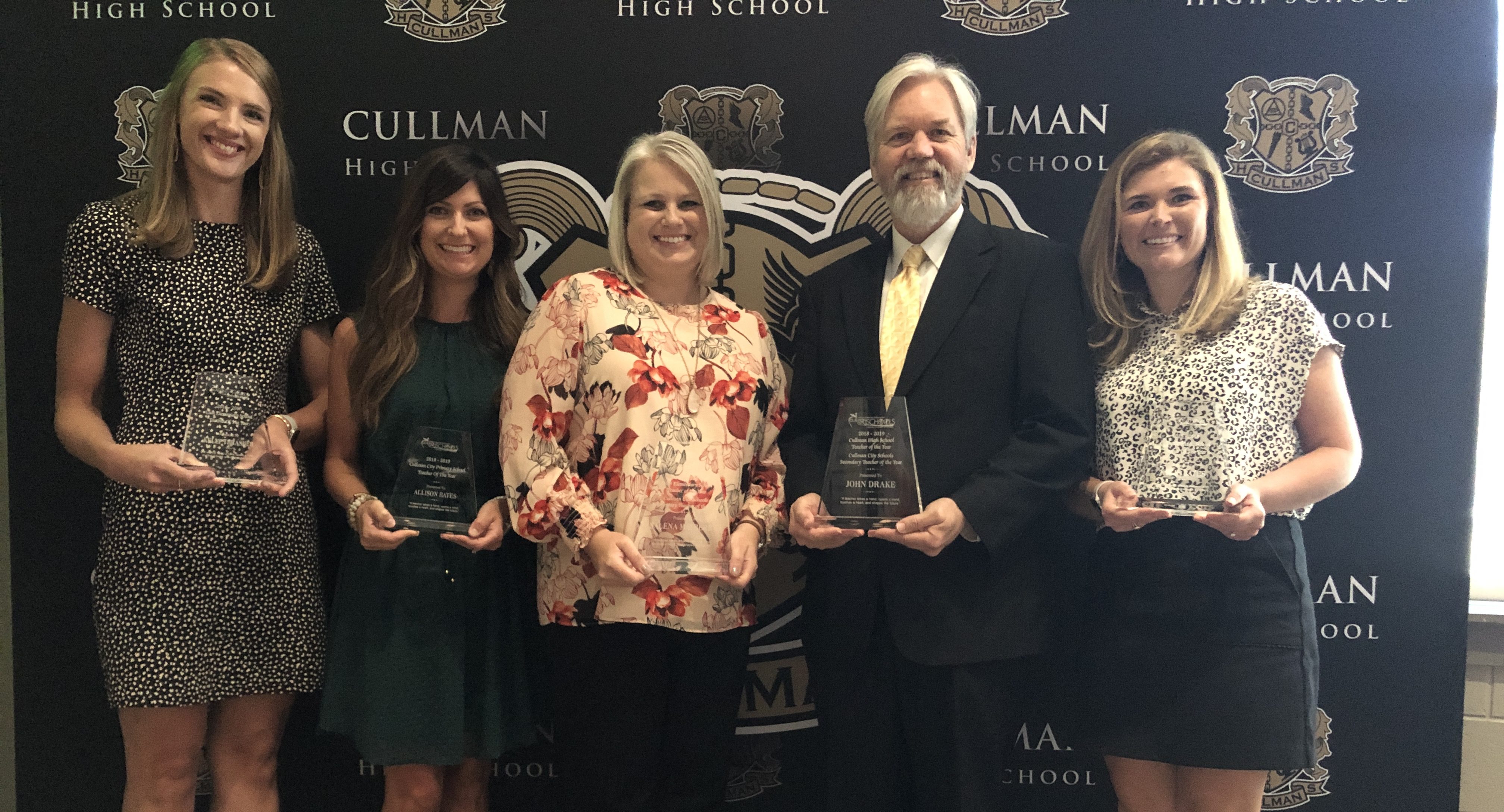 Left to right are East Elementary Teacher of the Year- Kelly Thrasher, special education; Cullman Primary Teacher of the Year- Allison Bates, first grade; West Elementary School and Overall Elementary Teacher of the Year- Salena Mayberry, third grade; Cullman High School and Overall Secondary Teacher of the Year- John Drake, multi-media design, business tech applications, television production and AP computer science principles; and Cullman Middle School Teacher of the Year- Kylie Bates, eighth-grade math.