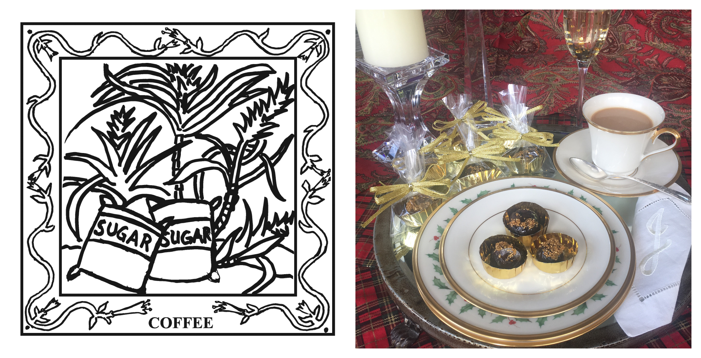 The Alabama honeysuckle border was inspired by an 18th century, Southern applique quilt. (left) Coffee County Southern Sugar Cane Candied Chestnuts (right)