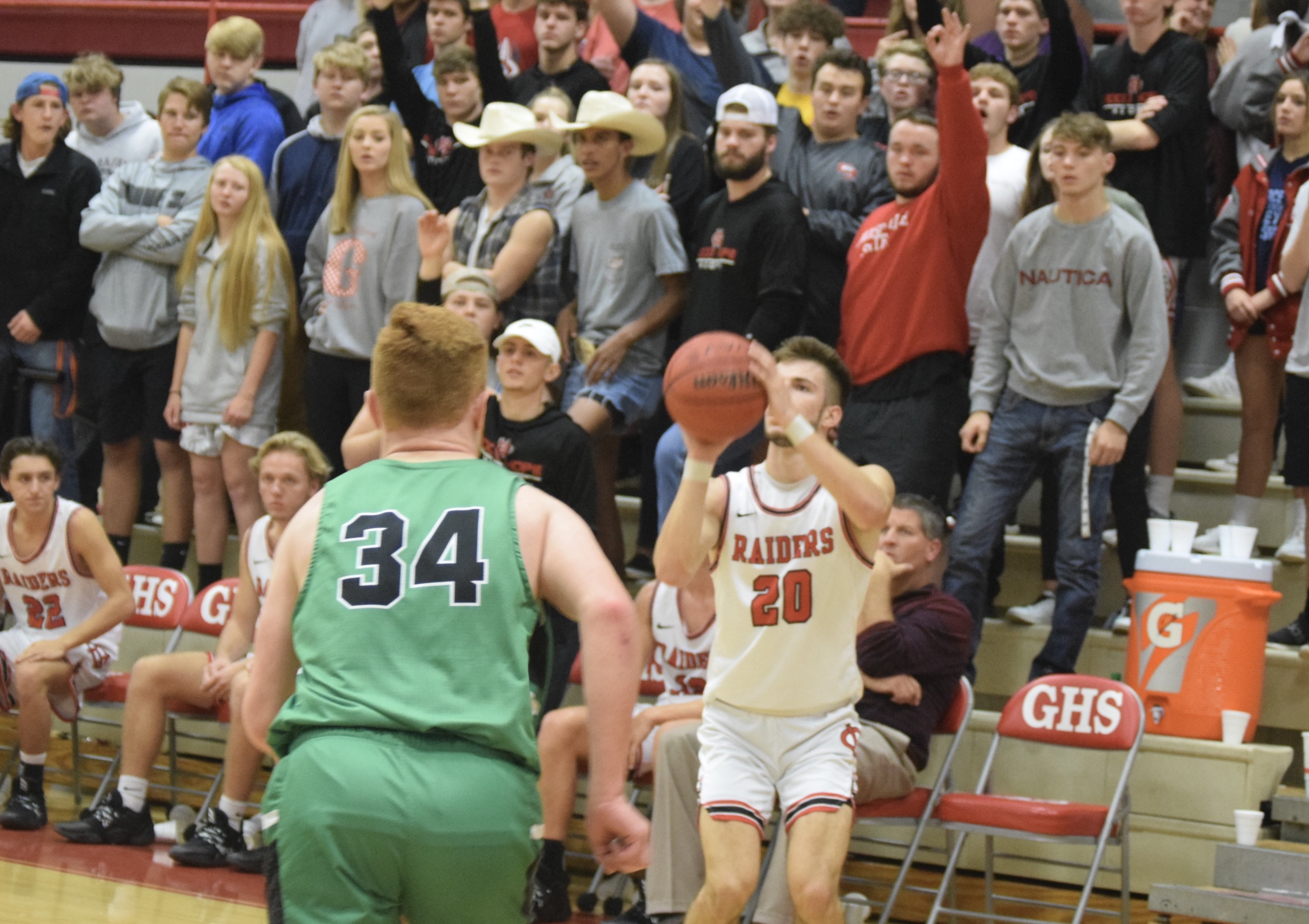 Good Hope’s Drew Maddox (20) racked up 38 points with seven makes from three-point range in the Raiders’ 85-66 win over Holly Pond Thursday night. (Sammy Confer for The Cullman Tribune)