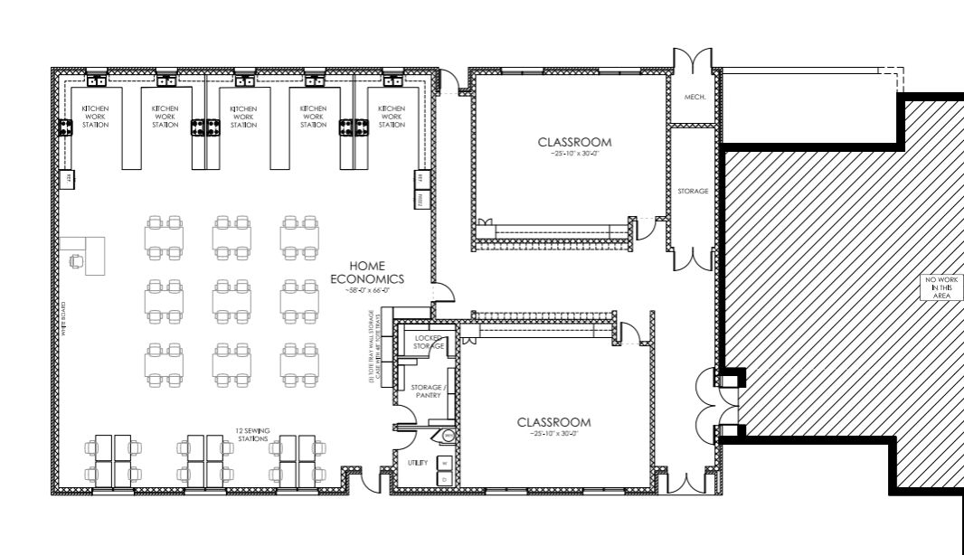 Plans for the new building feature a classroom with five kitchen work stations, 12 sewing stations, utility room and a storage room/pantry, as well as two additional classrooms and extra storage.