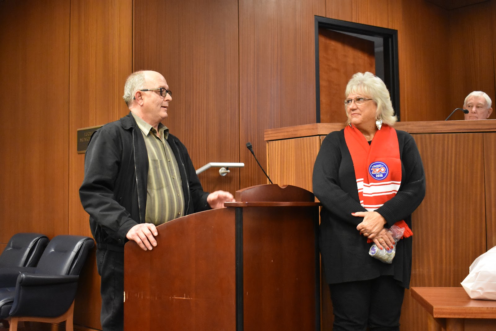 The Cullman County Bicentennial Committee’s Drew Green and Cindy Pass address the council about this Saturday’s Bicentennial celebration. (W.C. Mann for the Cullman Tribune)