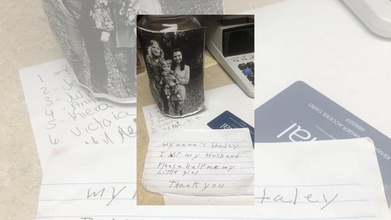 She explained, “I’ve already pressed charges, but I want to leave the name (of the person responsible) out of it. I’ve already pressed charges, but he went and set up donation jars and wrote notes saying, ‘My name is Haley and I lost my husband. Help me and my daughter.’ I’ve counted at least 10.”