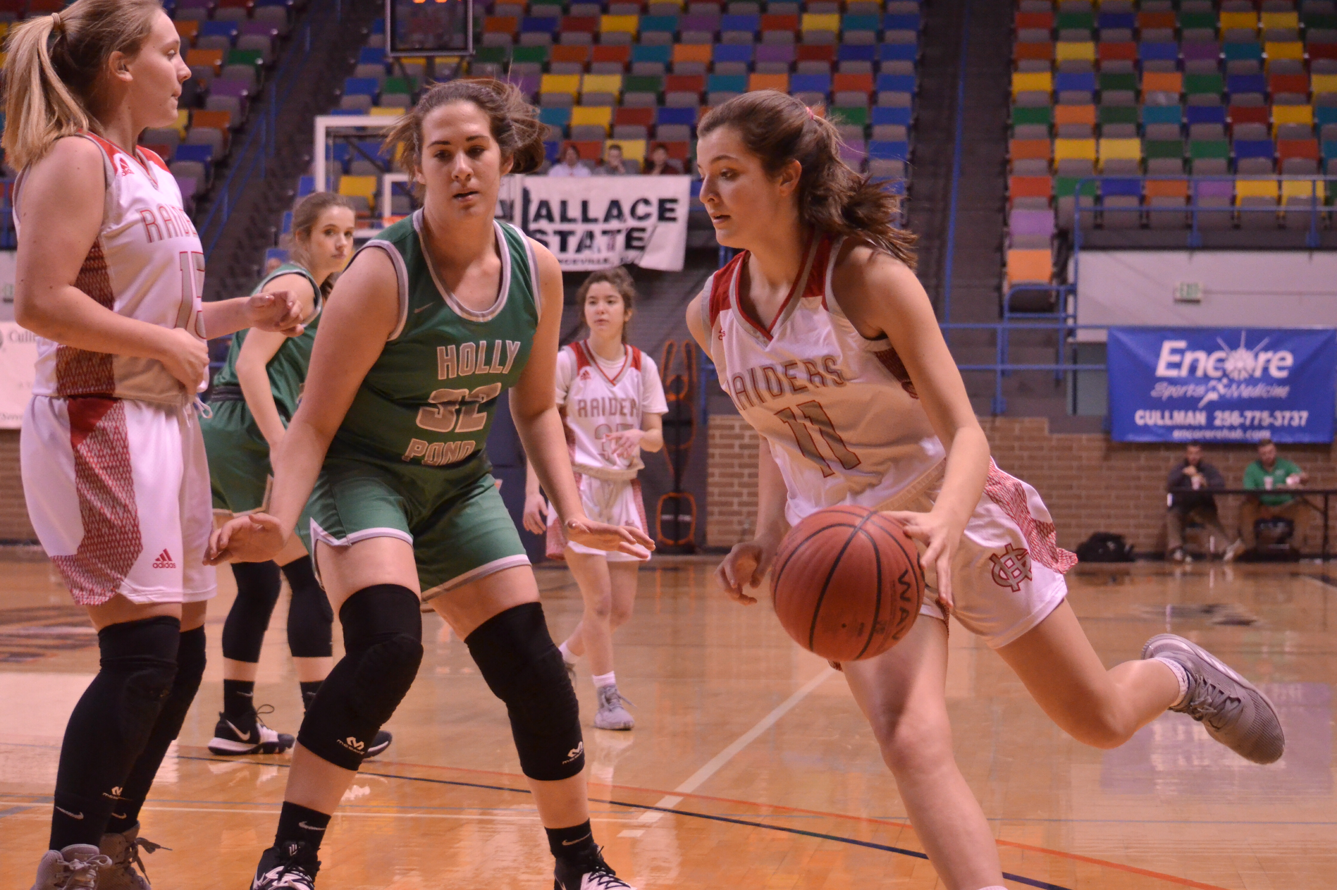 HANCEVILLE, Ala. – The middle seeds in this year’s varsity girls bracket faced off in Wednesday night’s first county tournament matchup and it was a heated battle between the Good Hope Lady Raiders and Lady Broncos of Holly Pond. After a tight first half, the Lady Raiders cranked things up on the defensive end and pulled away with a 56-43 win over Holly Pond to advance to the semifinals.
