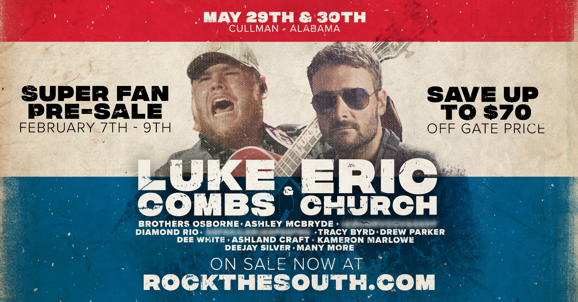 “Fans loved when Eric Church was with us a couple of years ago, and our social channels have been blowing up with requests for Luke Combs,” said Quick. “I’m excited to be able to have these two incredible artists on the Rock the South stage in Cullman this May.”