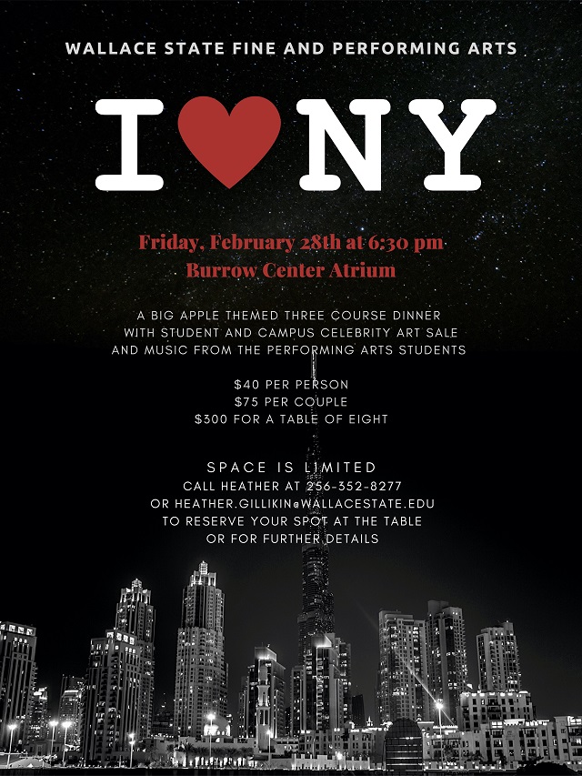 HANCEVILLE, Ala. – The Wallace State Community College Fine and Performing Arts program will offer a night in the “Big Apple” with an “I Love NY” cabaret dinner show Feb. 28.