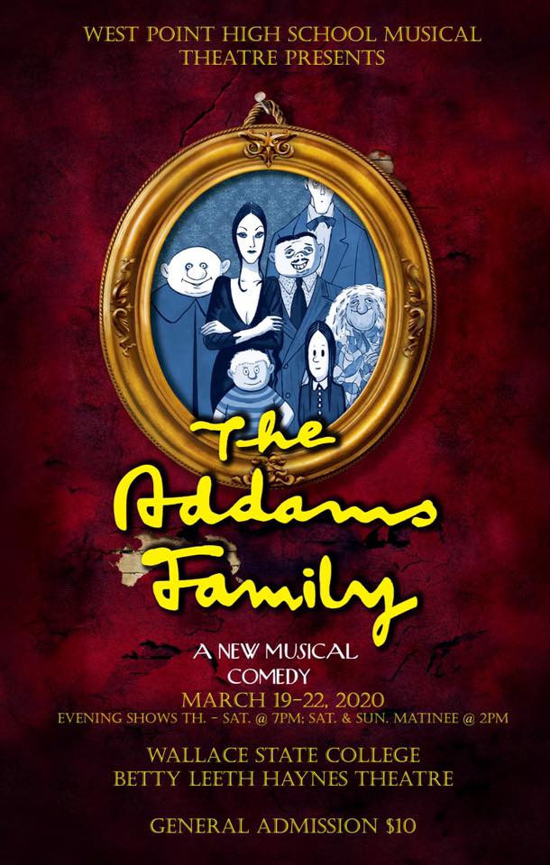 WEST POINT, Ala. – In less than a month, West Point High School’s theater department will showcase its talents on stage at Wallace State in “The Addams Family.” The students have been hard at work rehearsing for the upcoming musical about Wednesday Addam’s hope of marrying a young man from the “normal” Beineke family. West Point Theatre is under the direction of Jimmy and Kim Harbison.