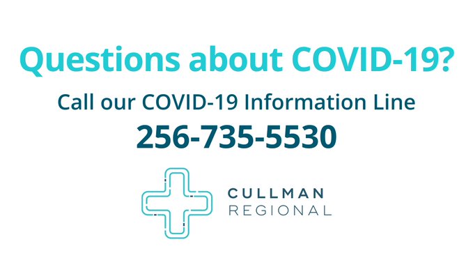 Residents who are concerned or have questions about COVID-19 and what they should do are advised to call Cullman Regional’s COVID-19 Information Line at 256-735-5530. The line is staffed seven days a week from 8 a.m.-10 p.m.