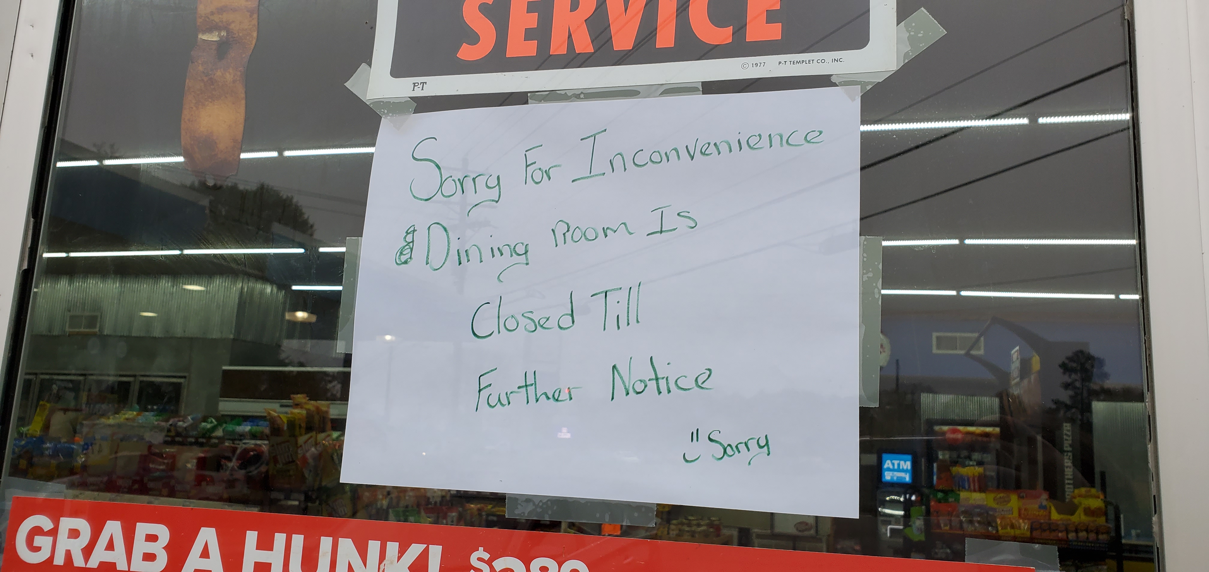 Restaurants around the county have had to post messages and signage like this one located at the Fairview Superette. The sign reads, “Sorry for inconvenience, dining room is closed till further notice. Sorry.” (Maggie Darnell/The Cullman Tribune)