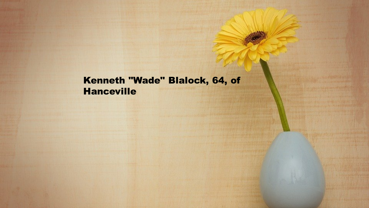Graveside services for Kenneth “Wade” Blalock, 64, of Hanceville, Alabama will be 1 p.m. Monday, March 30, 2020 at Shelton Grove Baptist Cemetery. Reverend Ray Ponder will be officiating. Mr. Blalock is survived by his son, Darrell Blalock; grandson, Myles Blalock; father, J.D. Blalock, and extended family and friends. Mr. Blalock is preceded in death by his mother, Rosie (Rogers) Blalock. Hanceville Funeral Home in charge of arrangements.