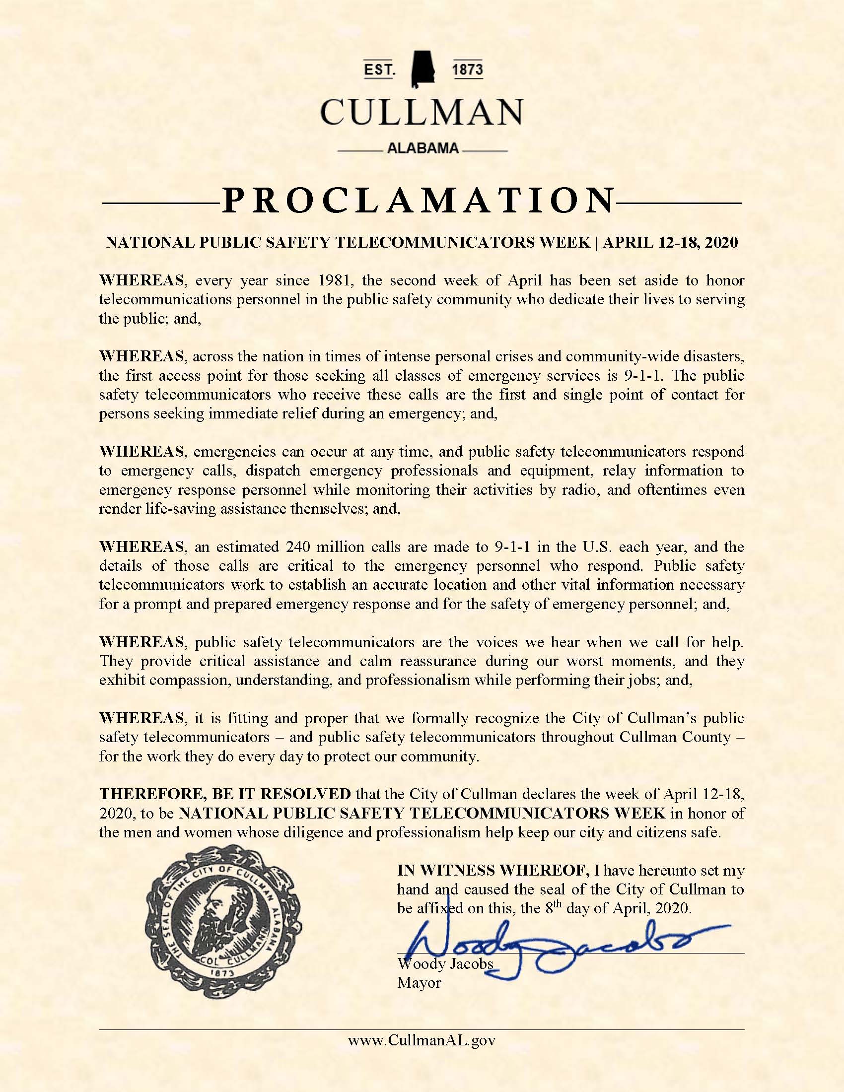 CULLMAN, Ala. – Cullman Mayor Woody Jacobs has proclaimed the second full week of April (April 12-18) as National Public Safety Telecommunicators Week. This week honors the thousands of men and women who respond to emergency calls, dispatch emergency professionals and equipment, and render life-saving assistance to our citizens.