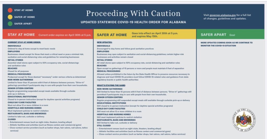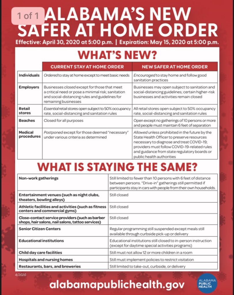 MONTGOMERY, Ala. – Alabama’s current Stay at Home Order will expire this Thursday, April 30, said Gov. Kay Ivey Tuesday morning.  Effective April 30, 2020 at 5 p.m., the State’s new Safer at Home Order will go into effect and will remain in effect until 5 p.m. May 15, 2020.