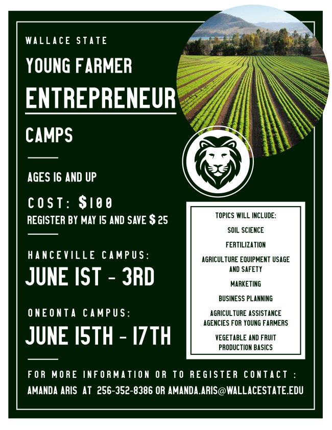 HANCEVILLE, Ala. – Wallace State Community College will host two three-day camps for teens and young adults interested in learning about building their own farming business. The Young Farmer Entrepreneur Camps will be held June 1-3 on the main campus in Hanceville and the other June 15-17 at the Oneonta campus.