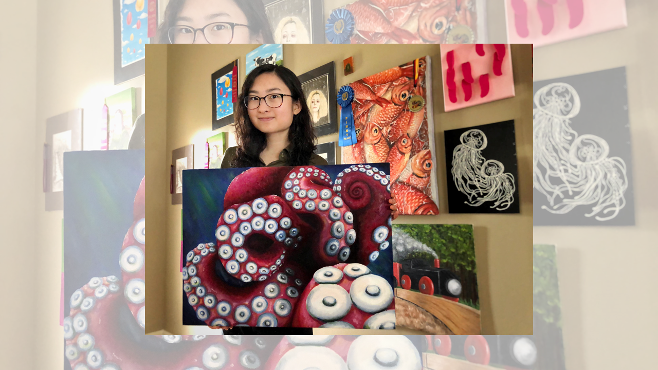 Said Miller, “Ayuka was one of my students in my Art Studio class. For that class, it’s more hands-off and it’s more like they have their own studio and they can create any project they want to. They have to create a portfolio and have a central theme to it. Hers was how she sees the world and different things like that. She wanted to do an octopus because she actually doesn’t like octopus. She thinks the tentacles kind of gross her out. She wanted to tackle something that she didn’t normally paint because she doesn’t like it. She was coming from that aspect of trying to overcome a challenge.”