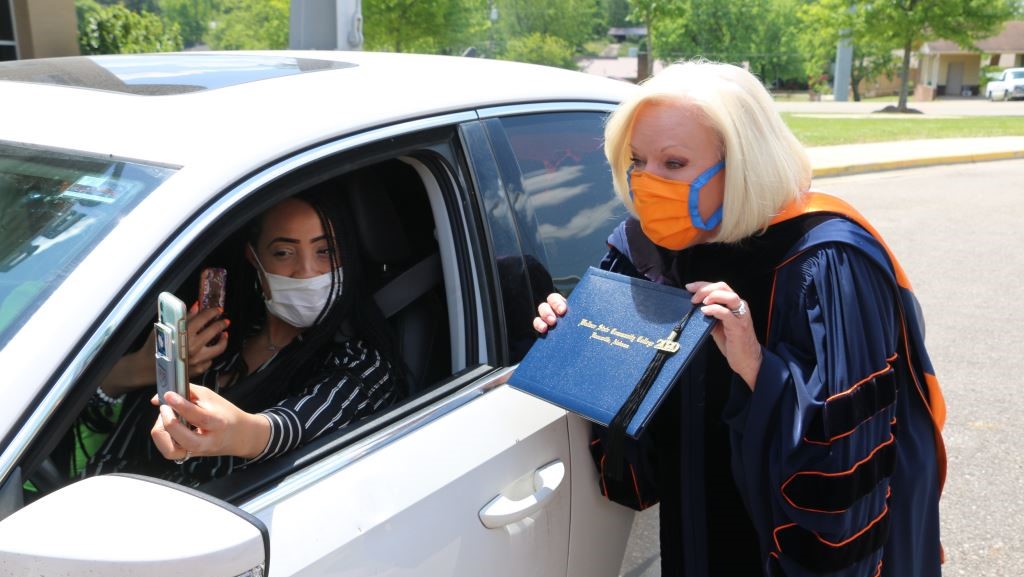 Wallace State President Dr. Vicki Karolewics awards diploma via FaceTime during drive-thru graduation celebration