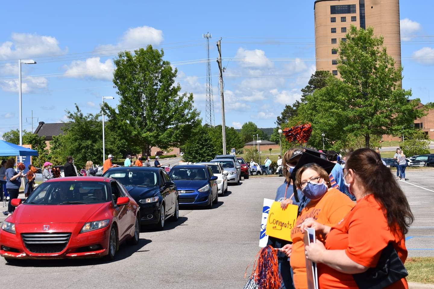 HANCEVILLE, Ala. – Although the original graduation ceremony has been postponed to July 31, the faculty and staff at Wallace State Community College wanted to give the graduating class of 2020 a more immediate way to celebrate its achievements. A sudden plan was devised during the WSCC cabinet meeting Monday, and just three days of preparation led to the college’s first drive-thru graduation ceremony, held just outside the Center for Fine and Performing Arts Thursday. Graduates drove up to the building in a parade of decorated cars to receive their diploma covers, tassels and free Chick-fil-A sandwiches.