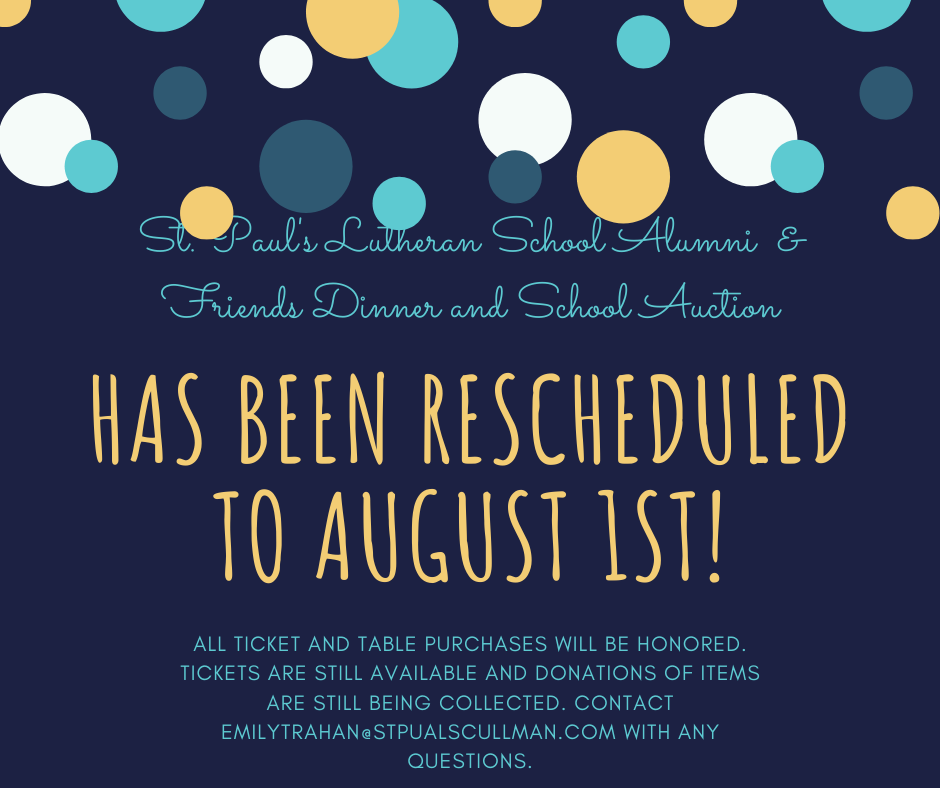 CULLMAN, Ala. – The St. Paul’s Lutheran School Alumni & Friends Dinner and School Auction that was originally scheduled for April 18 at Terri Pines has been rescheduled to Saturday, Aug. 1. All previous ticket and table purchases will be honored, and tickets are still available.