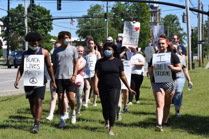 CULLMAN, Ala. – On Sunday afternoon, a group of young people who, at times, numbered around 25, came to Depot Park to protest racism and the killing of George Floyd in Minnesota. Through the afternoon, they waved at passers-by and walked around the park carrying signs reading “Black Lives Matter,” “I Can’t Breathe,” “Respect Existence or Expect Resistance,” “Be the Change” and other slogans.