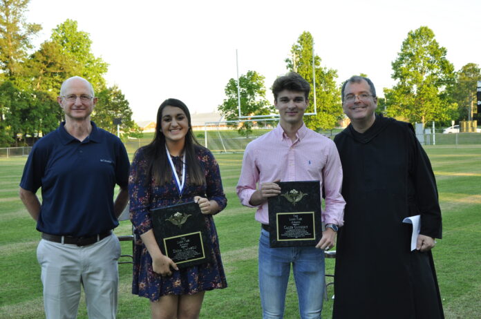 CULLMAN, Ala. — For the first time in eight weeks, Senior athletes gathered at St. Bernard on May 21 with their families to be recognized for their outstanding participation in Spring athletics for the 2019-20 academic year. Athletic Director, William Calvert welcomed those in attendance followed by an opening prayer from Headmaster, Fr. Linus Klucsarits, OSB. Senior athletes were escorted by their parents onto the soccer field. Coaches recognized athletes for their outstanding performances and wished them well as several are planning on running and participating at the collegiate level. Following the recognitions, the Fr. Luke Fazi Award which is the highest athletic recognition presented annually at the honors and awards event was presented to Emma Tafazoli and Caleb Guthery. This award is given in recognition of leadership and performance as well as academic excellence, to the best of one’s ability.